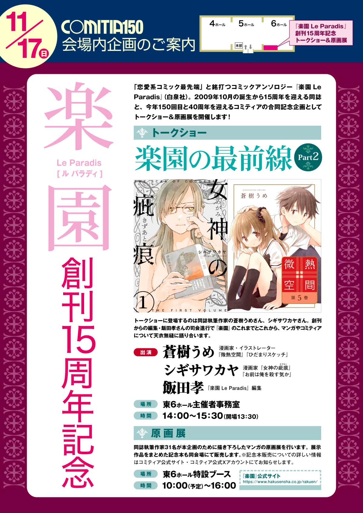 「恋愛系コミック最先端」と銘打つコミックアンソロジー『楽園 Le Paradis』(白泉社)。2009年10月の誕生から15周年を迎える同誌と、今年150回目と40周年を迎えるコミティアの合同記念企画として、トークショー&原画展を開催します!