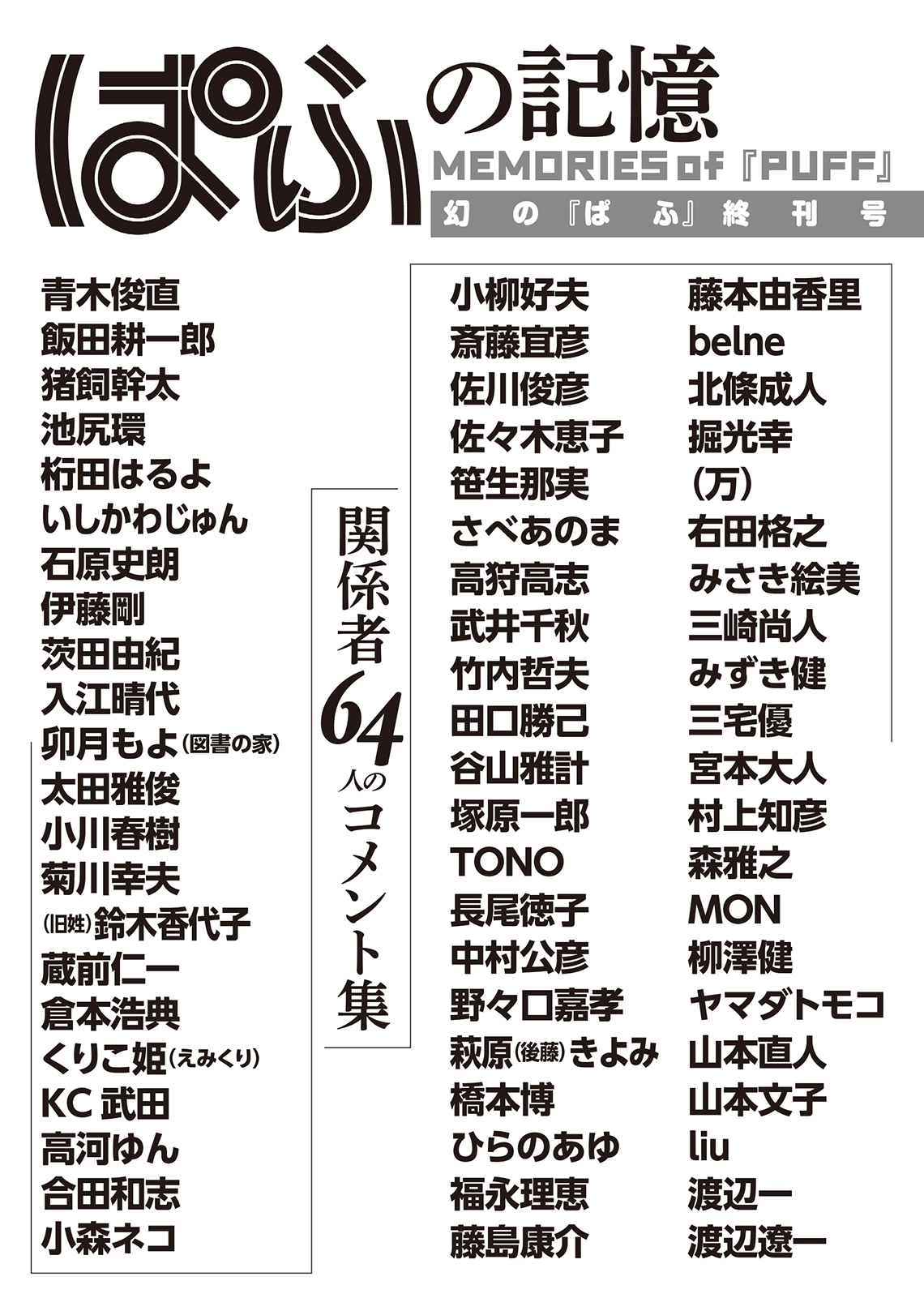 コミティアはまんが情報誌『ぱふ』の「マンガ同人誌紹介コーナー」から生まれました。その『ぱふ』も2024年に創刊から50周年を迎えています(2011年に休刊)。この記念の年に、当時の関係者・執筆者64人のコメントを集めた記録冊子を刊行します。編集責任者は元『ぱふ』編集長であり、コミティア実行委員会会長の中村公彦。『ぱふ』にまつわる懐かしい話、知らなかった話、忘れられない話を詰め込んだ一冊をどうぞお楽しみに。