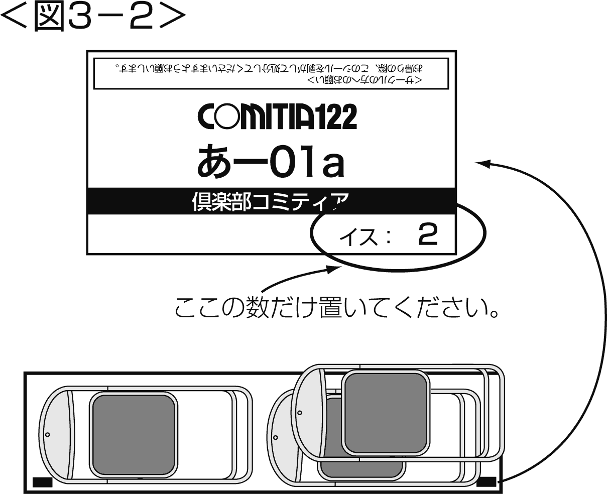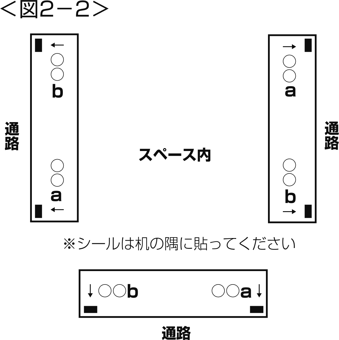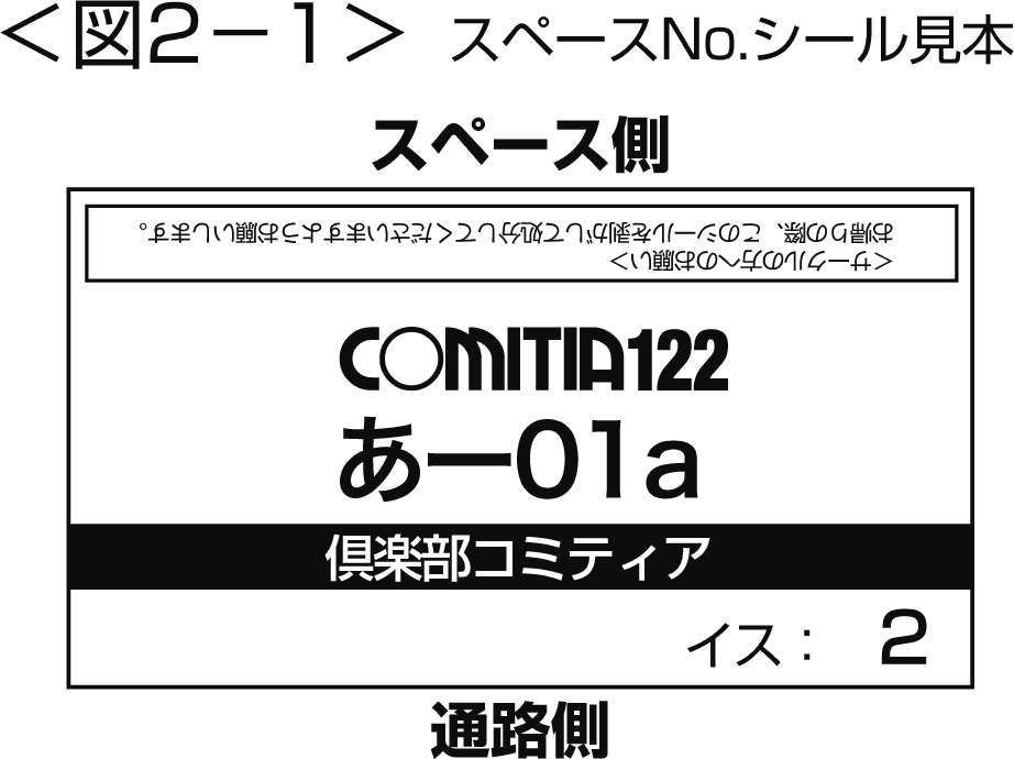 机に貼るスペースNo.シール(以下机シール)は、1サークルにつき1枚単位で印刷出力しています。よって机1本につき、2枚貼る必要があります。(図2-1)のようにスペース番号順に出力されたシールを配布します。貼る方向は、「スペース番号」と「サークル名」が通路側に向くように貼ってください(図2-1)。※見本はCOMITIA122であった場合の例です。